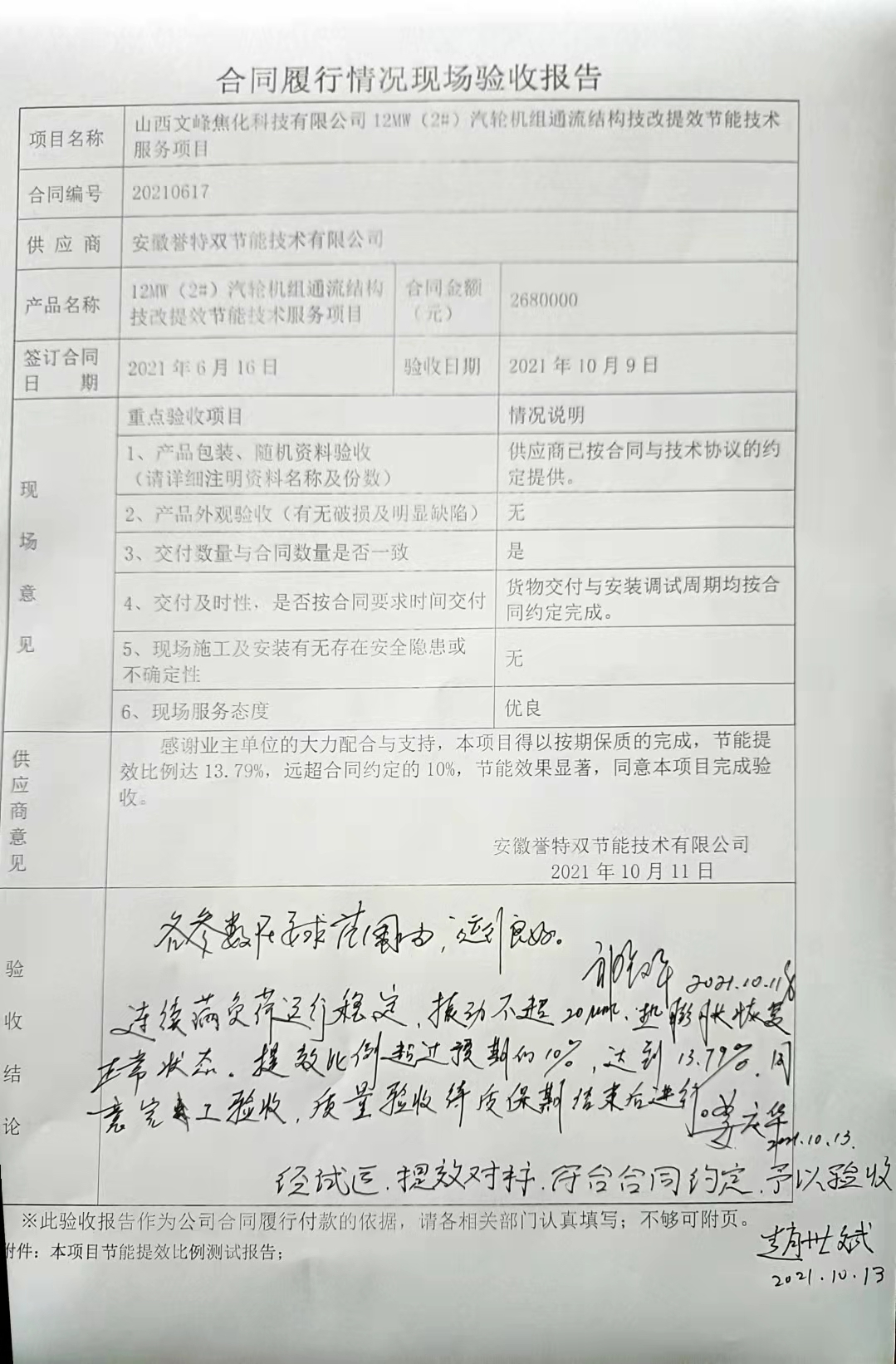 2021年10月13日,我公司技術(shù)服務(wù)項(xiàng)目——山西汾陽焦化12MW汽輪機(jī)組通流改造節(jié)能提效項(xiàng)目順利通過工程驗(yàn)收,節(jié)能提效比例達(dá)13.79%,遠(yuǎn)超合同約定的10%考核指標(biāo),在此表示熱烈祝賀。
