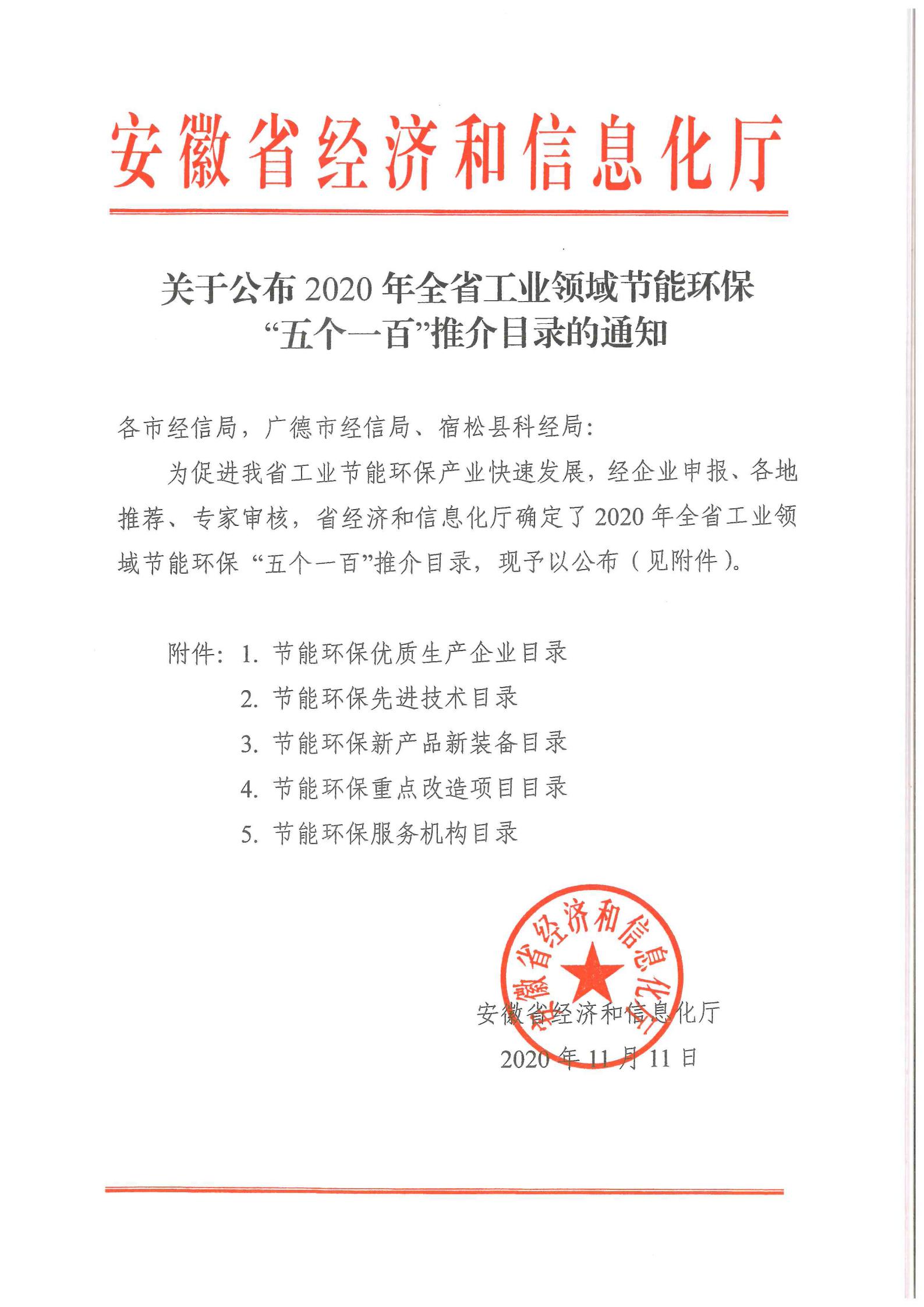 2020年11月11日,安徽省經信委發(fā)布2020年度全省工業(yè)領域節(jié)能環(huán)保產業(yè)“五個一百”推介目錄。