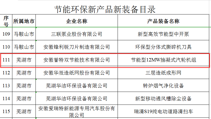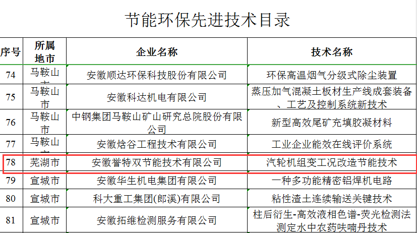 我公司“安徽譽特雙節(jié)能技術有限公司”入選“節(jié)能環(huán)保服務機構目錄、核心產品“節(jié)能型12MW抽凝式汽輪機組”入選節(jié)能環(huán)保新產品新裝備目錄、核心技術“汽輪機組變工況改造節(jié)能技術”入選節(jié)能環(huán)保先進技術目錄,此次入選,為公司連續(xù)四年入選。