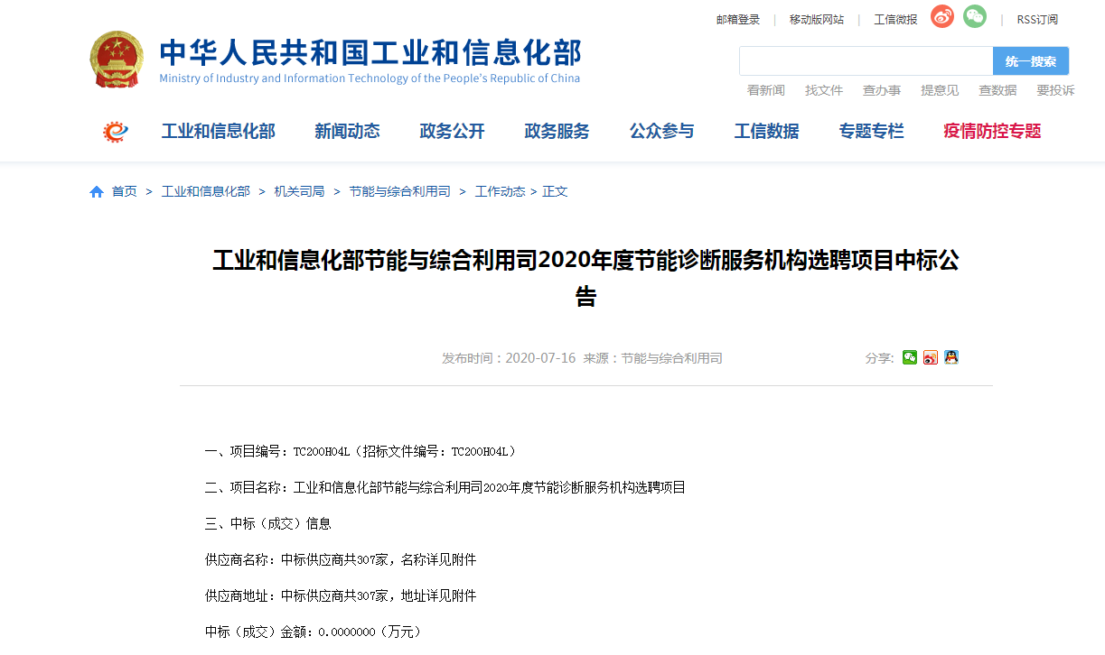2020年7月15日,公司成功中標工業(yè)和信息化部節(jié)能與綜合利用司“2020年度國家節(jié)能診斷服務(wù)機構(gòu)選聘項目合格供應(yīng)商”.