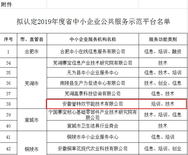 12月30日,我公司經(jīng)安徽省經(jīng)信廳認(rèn)定為2019年度省中小企業(yè)公共服務(wù)示范平臺(tái),本次全省共計(jì)評(píng)選出54家中小企業(yè)公共服務(wù)示范平臺(tái),其中蕪湖5家。