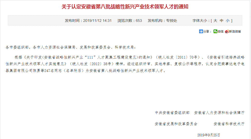 2019年11月12日,經(jīng)中共安徽省委組織部、安徽省人力資源和社會(huì)保障廳、安徽省發(fā)展和改革委員會(huì)、安徽省科學(xué)技術(shù)廳四部門(mén)聯(lián)合發(fā)文“經(jīng)過(guò)組織評(píng)審、實(shí)地考察、復(fù)核公示等程序,認(rèn)定安徽省第八批戰(zhàn)略性新興產(chǎn)業(yè)技術(shù)領(lǐng)軍人才名單,正式予以公布?!?/span>