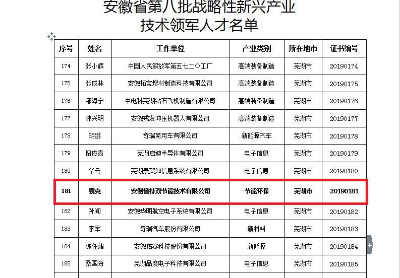 熱烈祝賀公司總經(jīng)理袁克同志認(rèn)定為安徽省第八批 戰(zhàn)略性新興產(chǎn)業(yè)技術(shù)領(lǐng)軍人才
