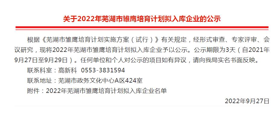 近日,經(jīng)市科技局統(tǒng)一組織申報、形式審查、專家評審、會議研究通過,公布2022年度蕪湖市雛鷹培育計劃入庫名單,我公司喜獲認定。