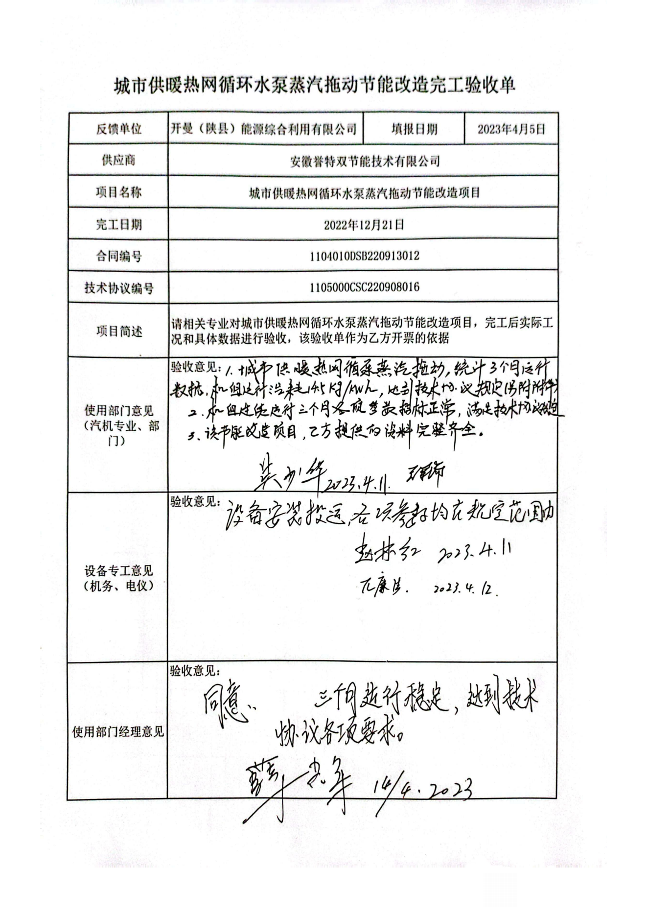 我公司以總包方式承接的——中國五百強錦江集團三門峽開曼能源3.15MW城市供暖熱網(wǎng)循環(huán)水泵蒸汽背壓拖動節(jié)能改造項目,于2022年12月20日一次性開機沖轉(zhuǎn)成功,高效汽輪機組替代電動機拖動循環(huán)水泵運轉(zhuǎn),經(jīng)過三個月的不間斷持續(xù)運行,機組各性能指標均達到設(shè)計參數(shù),運行正常穩(wěn)定,創(chuàng)造節(jié)能效益,現(xiàn)已通過工程驗收,標志著我公司在蒸汽拖動節(jié)能技改領(lǐng)域又建立一項標桿業(yè)績,歡迎廣大潛在用能單位蒞臨考察指導(dǎo)工作,節(jié)能環(huán)保,合作共贏!