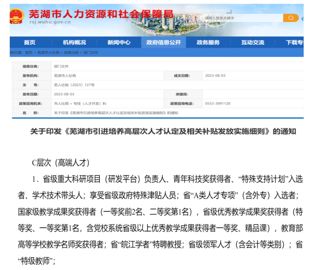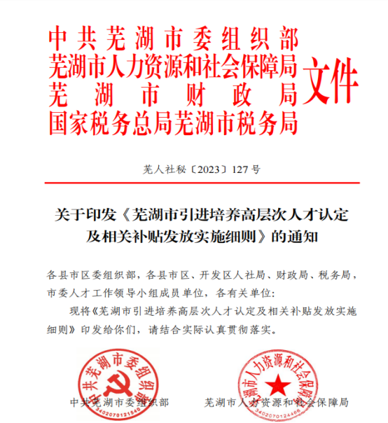 根據(jù)中共蕪湖市委組織部、蕪湖市人社局、財(cái)政局、稅務(wù)局聯(lián)合發(fā)布的《蕪湖市引進(jìn)培養(yǎng)高層次人才認(rèn)定及相關(guān)補(bǔ)貼發(fā)放實(shí)施細(xì)則》文件。