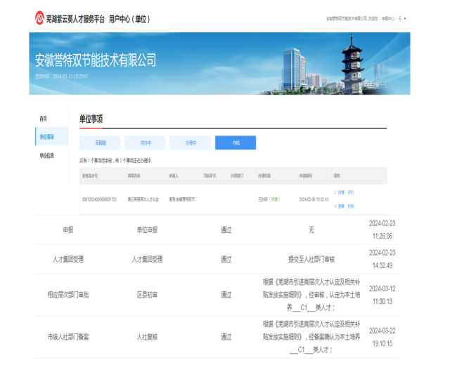 2024年3月22日,經(jīng)我公司自主申報(bào),結(jié)合袁克個(gè)人榮譽(yù)資質(zhì)---安徽省委組織部第八批特支計(jì)劃領(lǐng)軍人才、安徽省人社廳第八批戰(zhàn)略性新興產(chǎn)業(yè)技術(shù)領(lǐng)軍人才等認(rèn)定基礎(chǔ)上,通過(guò)蕪湖市人才集團(tuán)評(píng)定,區(qū)縣人社部門審核,市人社局備案,我公司總經(jīng)理袁克同志喜獲蕪湖市高層次C1類人才認(rèn)定,并可按規(guī)定享受相應(yīng)的住房、教育、醫(yī)療、人才津貼等優(yōu)惠獎(jiǎng)補(bǔ)政策。