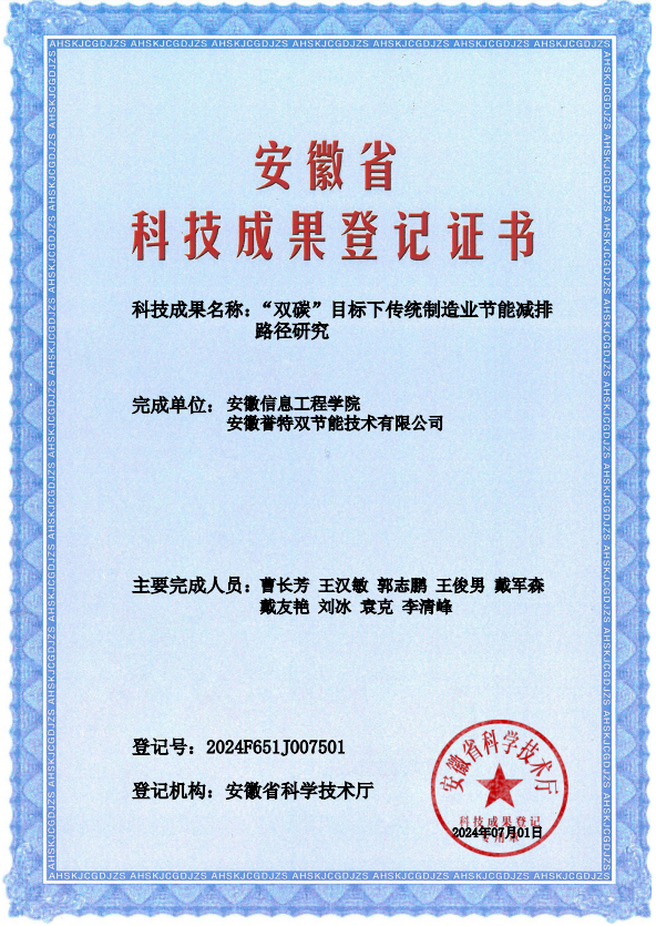 近日,我公司與安徽信息工程學(xué)院聯(lián)合研發(fā)的科技成果--“雙碳目標(biāo)下傳統(tǒng)制造業(yè)節(jié)能減排路徑研究”通過安徽省科學(xué)技術(shù)廳登記認(rèn)證,并發(fā)布登記證書。