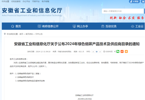2024年12月31日,為深入實施工業(yè)領域碳達峰實施方案,推動制造業(yè)綠色化發(fā)展,加快推進新型工業(yè)化,經(jīng)企業(yè)自愿申報、各地推薦、專家審核,最終由安徽省工業(yè)和信息化廳公布2024年綠色低碳產(chǎn)品技術及供應商目錄,我公司三個項目入選榜單,在此表示熱烈祝賀!