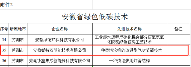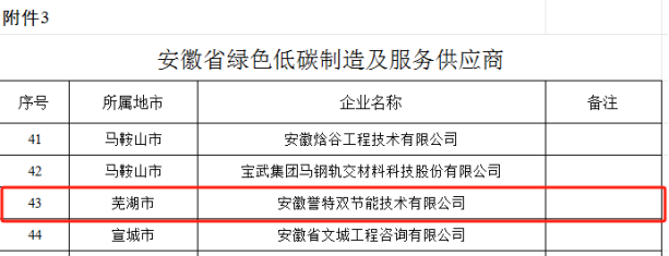 公司分別入選“安徽省綠色低碳產(chǎn)品(裝備)”、“安徽省綠色低碳技術”、“安徽省綠色低碳制造及服務供應商”目錄。其中安徽省綠色低碳制造及服務供應商目錄中,安徽省全行業(yè)領域共計58家企業(yè),我公司為蕪湖市唯一一家入選企業(yè),同時也是公司連續(xù)7年入選該目錄,再次表示熱烈祝賀!